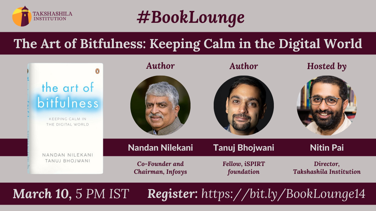 We are pleased to invite you to a #BookLounge webinar featuring The Art of Bitfulness. The authors, Nandan Nilekani and Tanuj Bhojwani will be in conversation with Nitin Pai.
